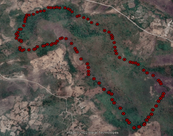 La photo ci-dessus présente la dernière image prise par le satellite de la société Maxar de la forêt de Fello-Bhasso (délimitée par les points rouges), dans laquelle l’AKGN mène une politique d’enrichissement en espèces locales par des plantations d’arbres. Cette image date d’avril 2019 et constitue donc une image de la forêt antérieure à l’action de reboisement.